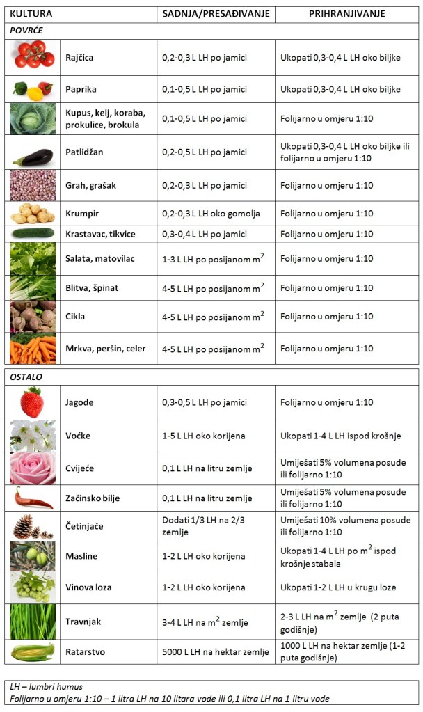 - za prihranjivanje biljaka tijekom cijele godine (stavljanjem lumbri humusa direktno u tlo ili folijarno).